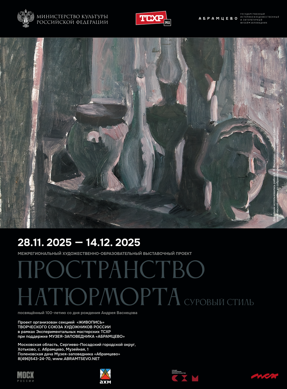 «Выставка «Пространство натюрморта. Суровый стиль» посвящена одному из любимых жанров живописцев 20 века; жанру, открывшему широкое поле для творческих экспериментов и самых смелых художественных деклараций. Художники новейшего времени воспринимали натюрморт как личную лабораторию, необходимую для выработки своей пластической системы отображения современности. У каждой выставки есть своя особая атмосфера. Собрание натюрмортов за более чем сто лет в нынешней экспозиции отличается удивительной целостностью историко-художественной концепции и преемственностью стиля. В зале словно встретились за дружеской беседой очень близкие по духу, школе, пластическим пристрастием художники. Камертоном выставки послужила превосходная коллекция произведений русских художников из фондов Музея-заповедника «Абрамцево». Имена художников из фондов музея Абрамцево значимы: Петр Кончаловский, Роберт Фальк, Илья Машков, Василий Рождественский, Александр Осмеркин...Павел Никонов, Николай Андронов, Федор и Андрей Васнецовы.